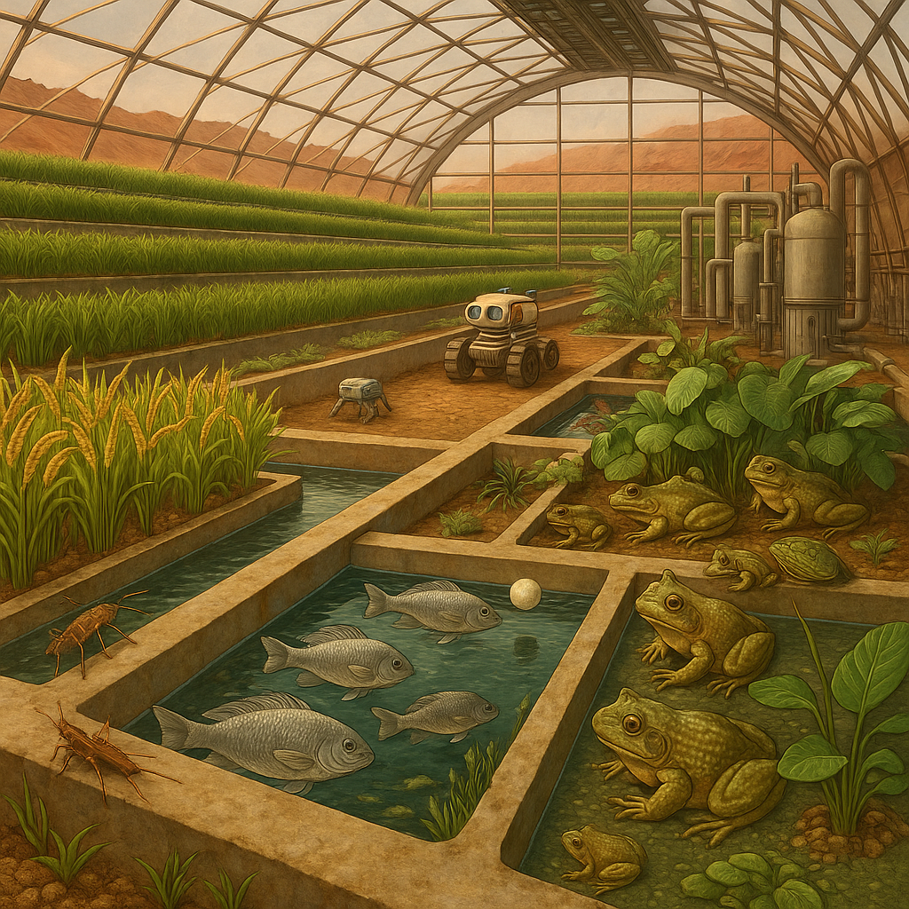 La agricultura marciana ha evolucionado hacia sistemas de cultivo mixto, integrando plantas, peces, crustáceos y anfibios como parte de un ecosistema cerrado. Estos organismos no solo son fuentes eficientes de proteínas, sino que requieren significativamente menos agua, oxígeno y alimento en comparación con aves o mamíferos. Las ranas toro, por ejemplo, poseen una excelente relación nutricional por unidad de peso/volumen, se adaptan bien a entornos controlados y pueden contribuir también al equilibrio ecológico mediante el control de insectos. Crustáceos como camarones y peces pequeños como tilapias son criados en módulos acuapónicos conectados a sistemas de reciclaje biológico.